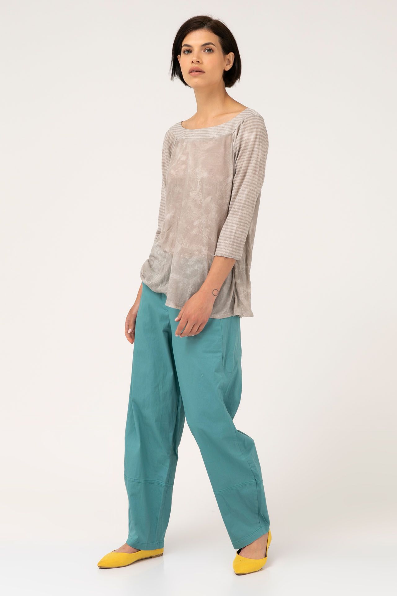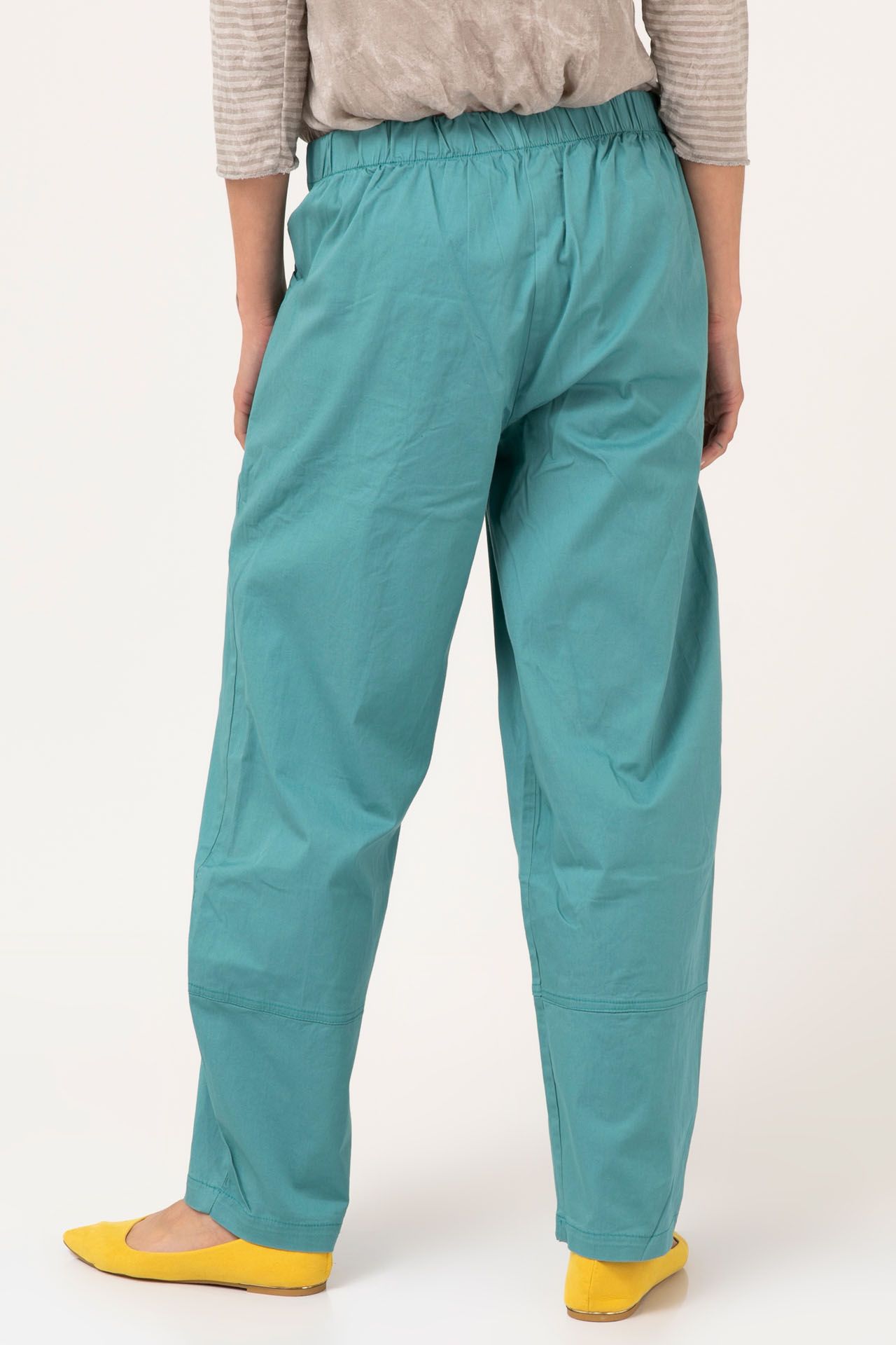 | מכנסיים מבד אריג בגזרה שנאספת בחלקם התחתון, עם כיסים קידמיים וגומי במותן |