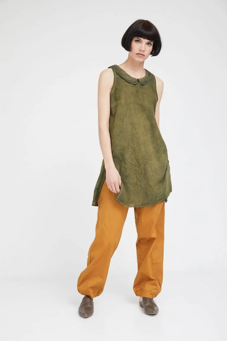 | גופיית טוניקה מבד אריג, מפתח הצוואר עגול עם צווארון קטן לבן ושליצים בצדדים. |