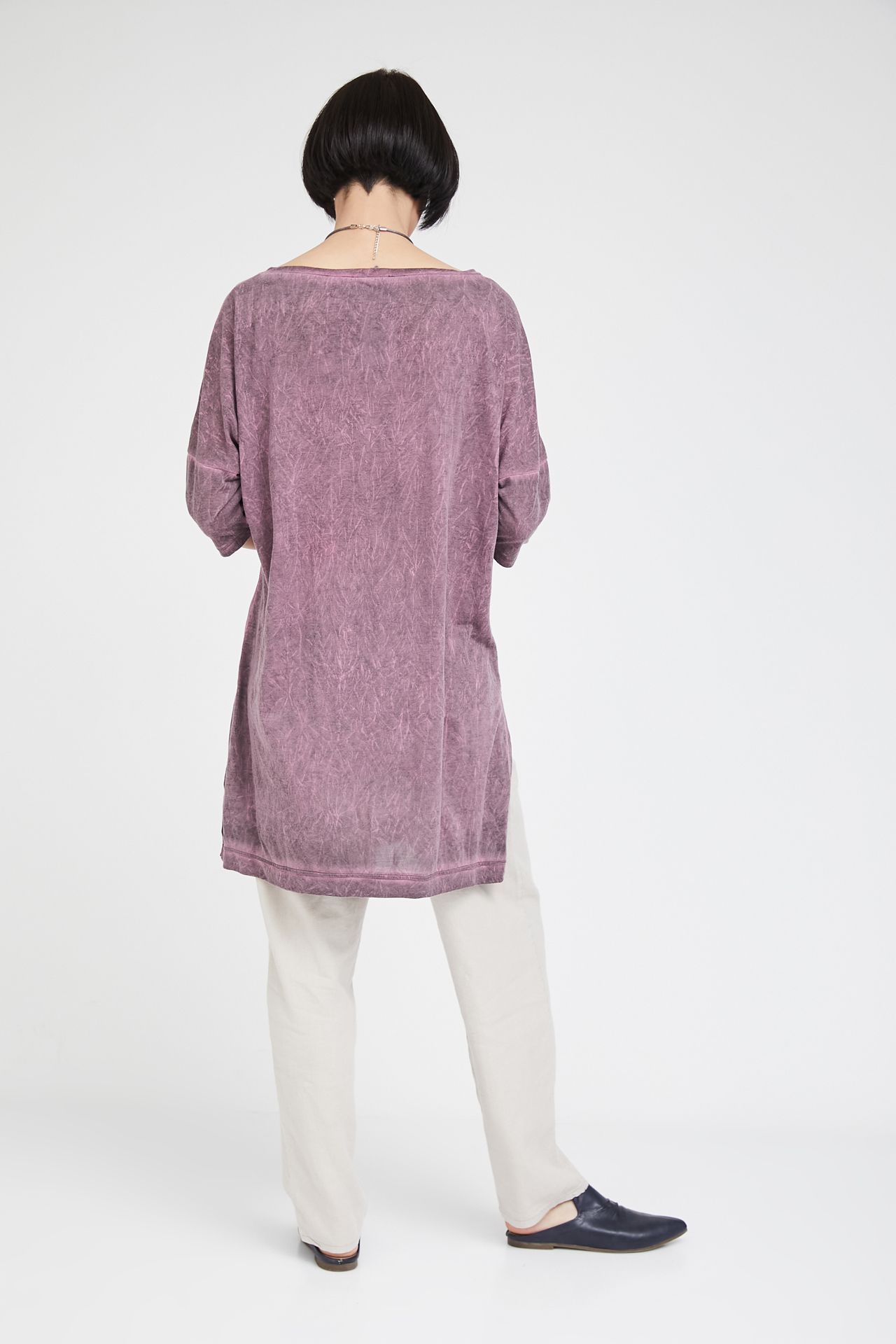 | חולצת טוניקה מבד סריג דקיק מקומט עם שרוול העובר את קו המרפק ומחשוף עגול |