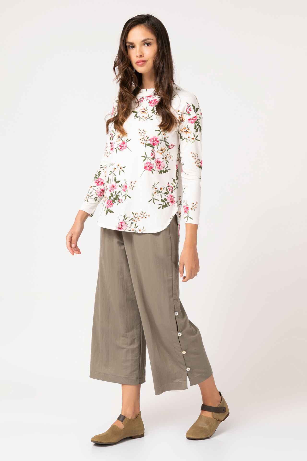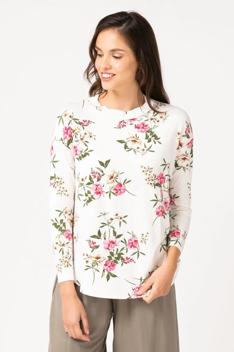 | חולצת סריג סמפוניה דק. לחולצה חלק אחורי ארוך מהחלק הקדמי, מחשוף עגול ושרוולים ארוכים. |