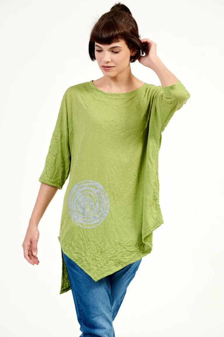 | טוניקה אסימטרית מבד סריג דק מקומט שאינו דורש גיהוץ, מחשוף עגול ושרוולי 3/4. על כל חולצה מודפסת בדפוס ידני דוגמת ספיראלה מקסימה |