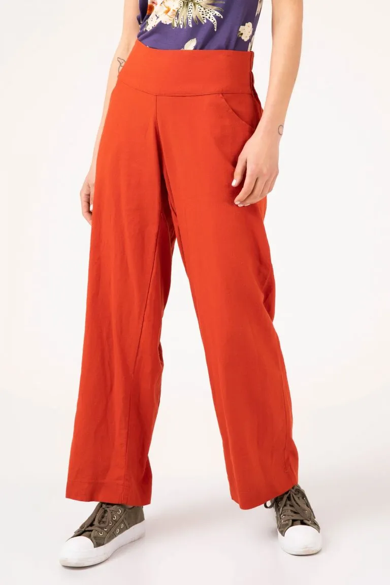 | מכנסיים מבד אריג פשתן בגיזרה רחבה, עם גומי בגב עיבוד רחב מחמיא באיזור הבטן והמותן וכיסים קידמיים |