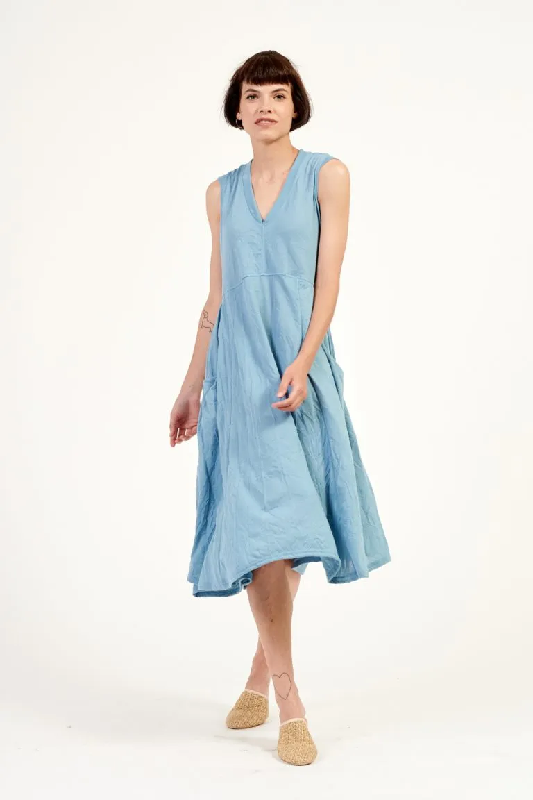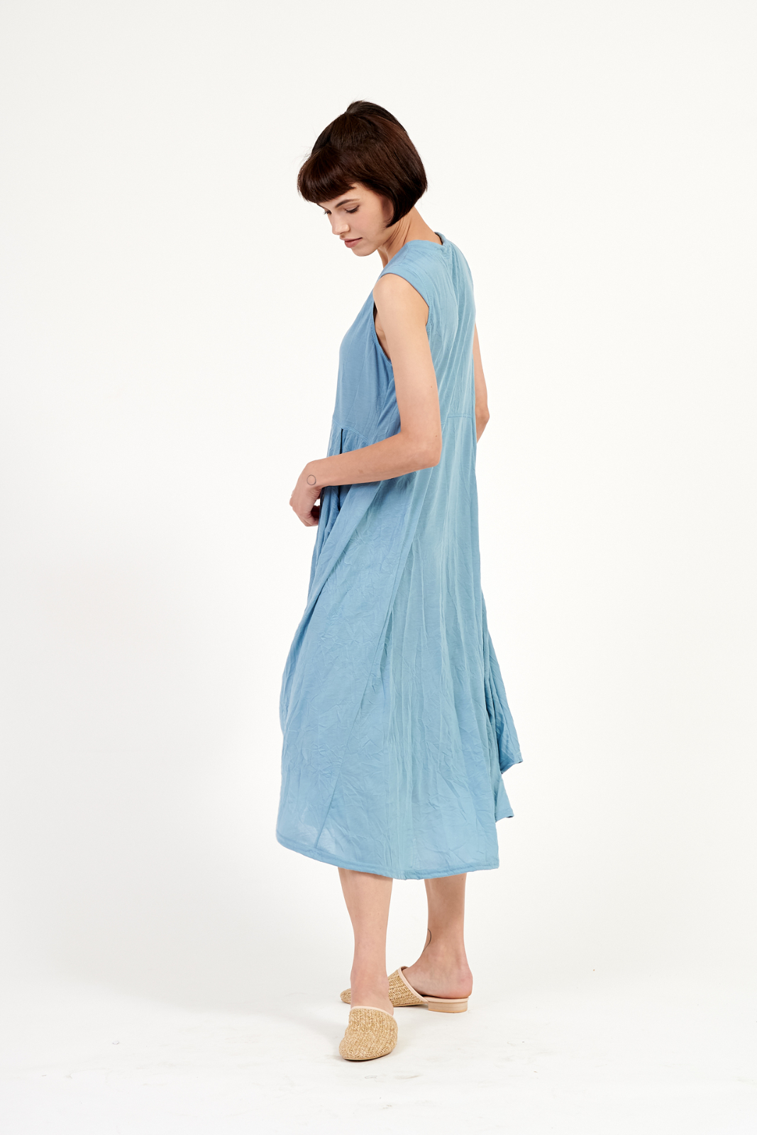 | שמלה ארוכה עם שרוולים קטנים מבד סריג במראה מקומט וקליל. לשמלה גיזרה מתרחבת, עם חתך מתחת קו החזה, מפתח הצוואר V ושני כיסים בצידי השמלה. |