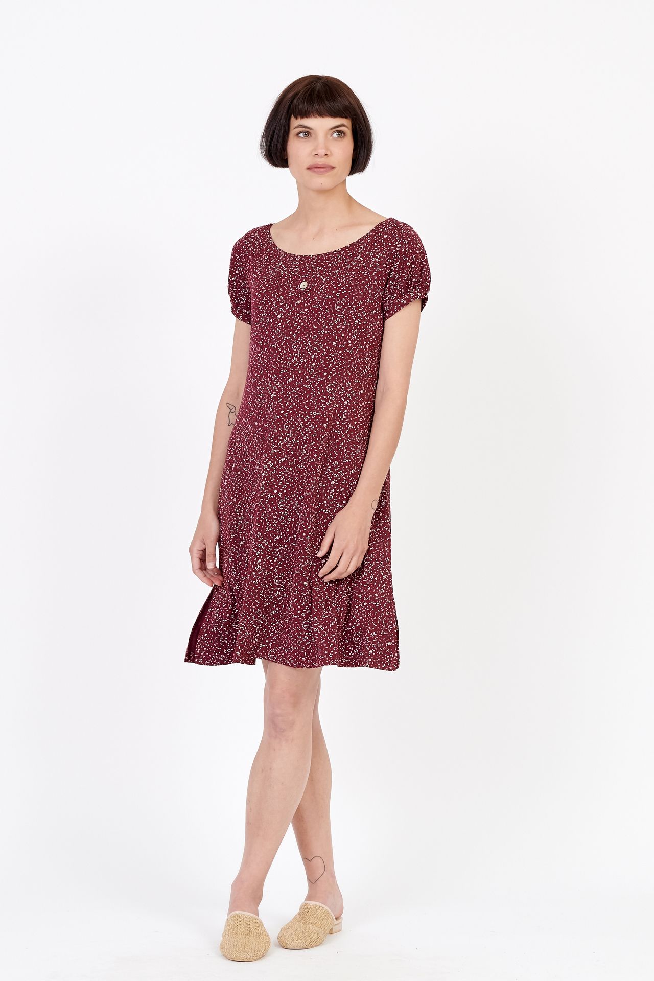 | השמלה קצרה וצעירה בגזרת מקולקצית NATURALA, עם שרוולים קצרים נפוחים מעט, מפתח צוואר עגול סגירה בכפתור בגב וכפתור דקורטיבי בחזית. |