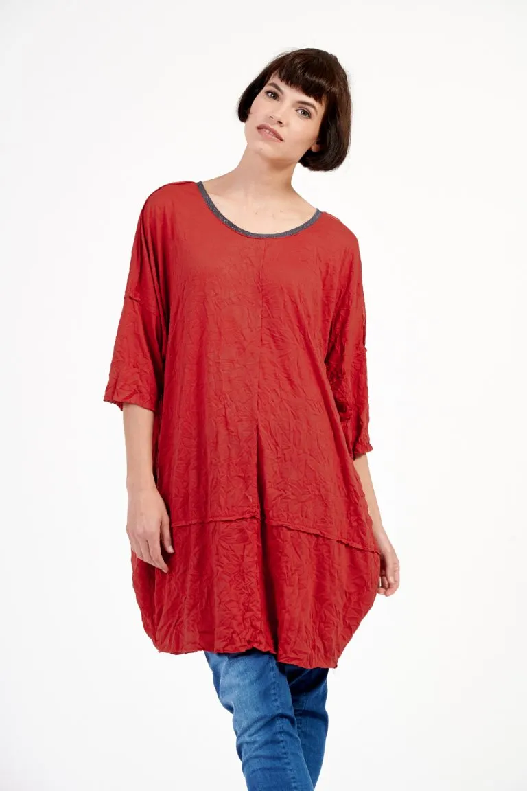 | שמלה קצרה מבד סריג דקיק ומקומט בגזרת בלון מעודן נוגעת לא נוגעת, עם שרוולים באורך המרפק, מפתח צוואר עגול וכיסים בצידי השמלה. ניתנת ללבישה כשמלה או כטוניקה. חלקי השמלה תפורים בצורה שטוחה ושולי הבד נקיים מתפרים. |